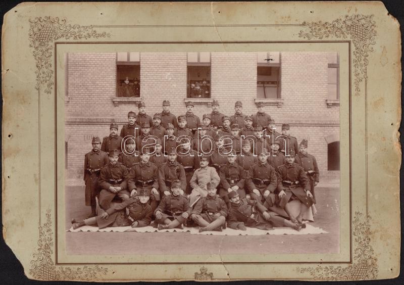 Leírás: cca 1900-1914 Katonák csoportképe, kartonra ragasztva, sérült, 16,5×22,5 cm