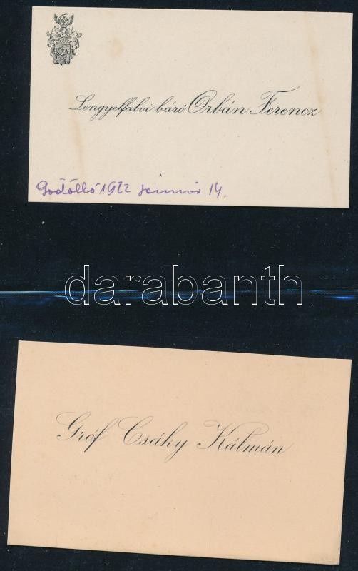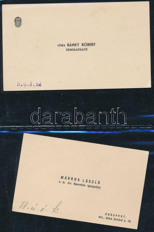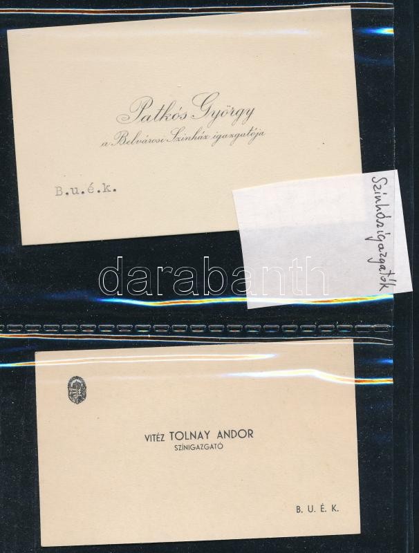 cca 1910-1940 Színházigazgatók és arisztokraták 7 db névjegykártyája https://www.darabanth.com/hu/298-Gyorsarveres/298.0/Festmeny-mutargy-papirregiseg-egyeb/Nyomtatvanyok~100026/cca-1910-1940-Szinhazigazgatok-es-arisztokratak-7-db-nevjegykartyaja~II1595847
