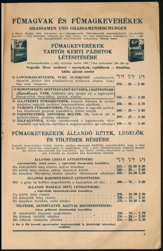 Leírás: 1940 Mauthner Ödön Magtermelő és Magkereskedelmi Rt. árjegyzéke, képekkel, sérült borítóval, 128 p.