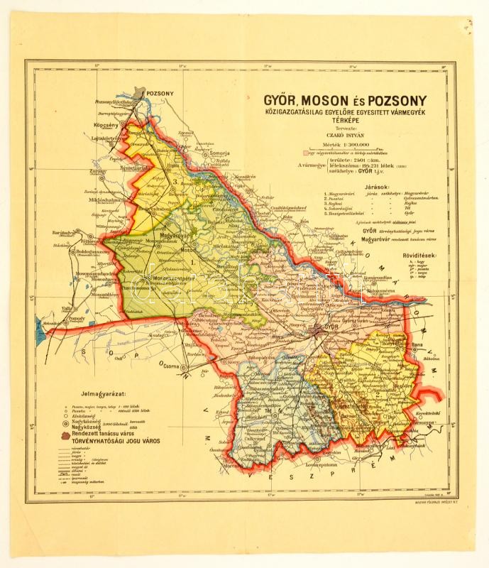 1942 Győr, Moson és Pozsony közigazgatásilag egyelőre egyesített vármegyék közigazgatási térképe. Tervezte: Czakó István. Bp., Magyar Földrajzi Intézet Rt., hajtásnyomokkal, 39x34 cm