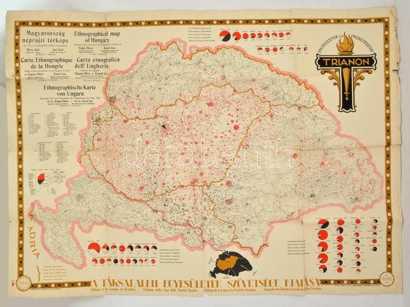 cca 1920 "Emlékezzetek és emlékeztessetek!-Trianon." Magyarország néprajzi térképe. Társadalmi Egyesületek Szövetségének kiadása. Az 1910. évi népszámlálás alapján szerkesztették Dörre Jenő, Lux Ernő, 1:900.000, Klösz Gy. és Fia, Bp., hajtásnyomokkal, a hajtások mentén szakadozott, 83x115 cm.