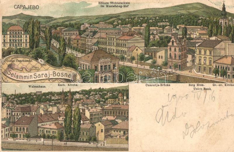 Sarajevo, Mustafabeg-Hof, Gumurija Brücke, Union Bank, Waisenhaus, Corps-Commando / bridge, bank, military command. Ed. Strache's Art Nouveau, litho (Rb)