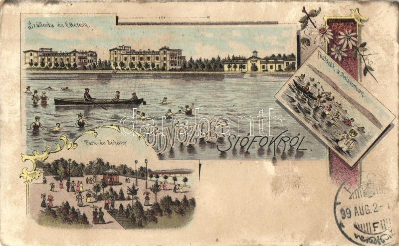 Leírás: 1899 Siófok, fürdőzők a Balatonban, szálloda és étterem, park és sétány. Art Nouveau, floral, litho (fl)
