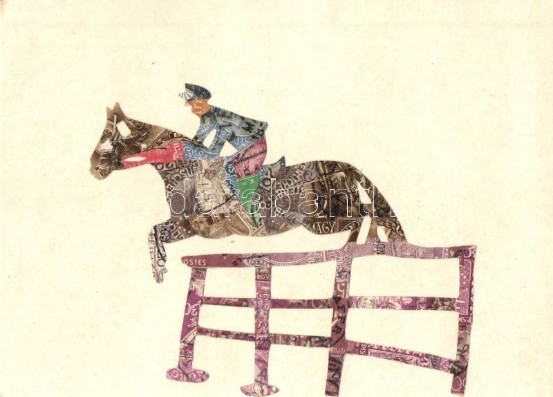Leírás: Díjugratás. Bélyegekből kivágott és összeragasztott képeslap. Budai nyomda / Show jumping. Made out of stamps