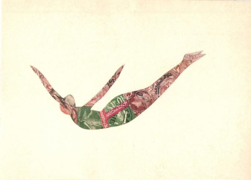 Leírás: Műugrás. Bélyegekből kivágott és összeragasztott képeslap. Budai nyomda / Diving. Made out of stamps