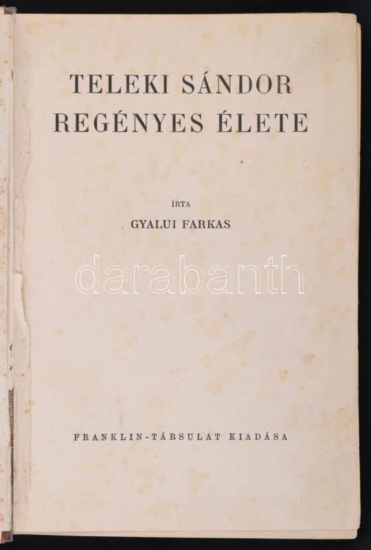 Leírás: Gyalu Farkas: Teleki Sándor regényes élete. Bp., é.n., Franklin-Társulat. Kiadói félvászon-kötés, megviselt állapotban, javított gerinccel, hiányzó elülső előzéklappal.