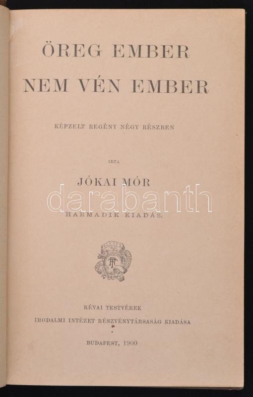Jókai Mór: Öreg ember nem vén ember. Képzelt regény négy részben. Jókai Mór Ujabb Regényei. Bp., 1900, Révai. Harmadik kiadás. Kiadói festett, aranyozott egészvászon-kötés, márványozott lapélekkel. Jó állapotban.