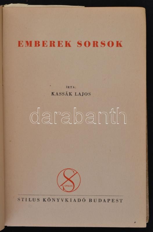 Kassák Lajos: Emberek és sorsok. Bp., 1943, Stilus Könyvkiadó. Kiadói ... https://www.darabanth.com/hu/298-Gyorsarveres/298.0/Konyvek/Konyvek-Egyeb-ritkasagok~400016/Kassak-Lajos-Emberek-es-sorsok-Bp-1943-Stilus-Konyvkiado-Kiadoi-felvaszon-kotes-aja~II1591893