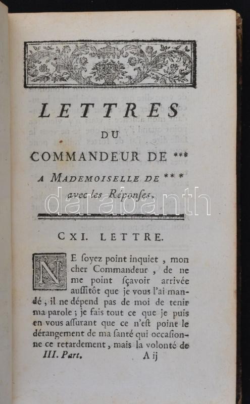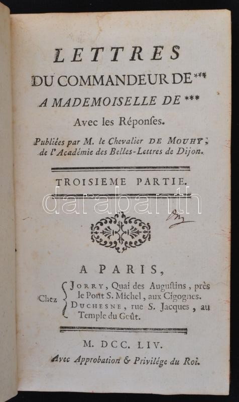 Mouhy, [Charles de]: Lettres du commandeur de *** a mademoiselle de ***. 3. rész. Párizs, 1754, Jorry - Duchesne. Sérült bőrkötésben, egyébként jó állapotban.