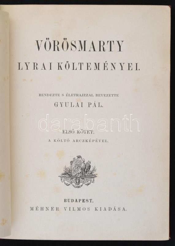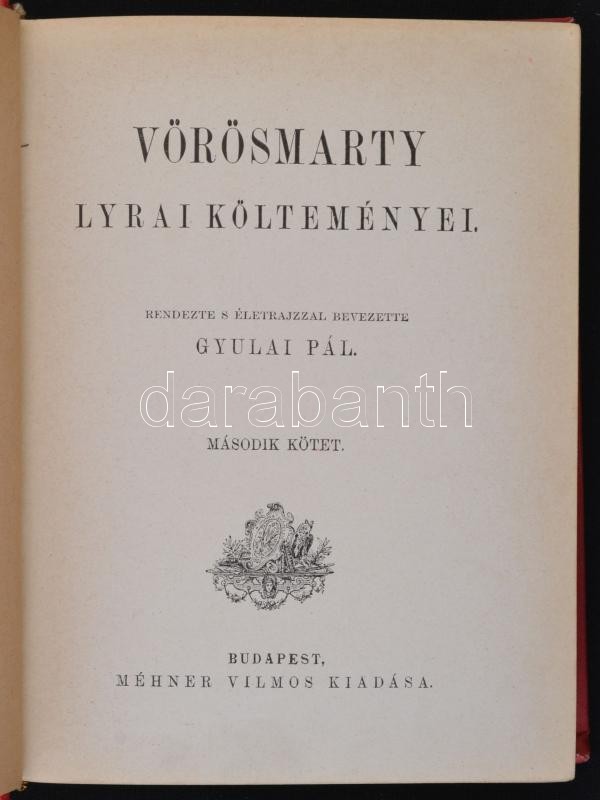 Vörösmarty Mihály Lyrai Költeményei I-II. Bp., é.n., Méhner Vilmos. Ki... https://www.darabanth.com/hu/298-Gyorsarveres/298.0/Konyvek/Konyvek-Egyeb-ritkasagok~400016/Vorosmarty-Mihaly-Lyrai-Koltemenyei-I-II-Bp-en-Mehner-Vilmos-Kiadoi-aranyozott-feste~II1591894