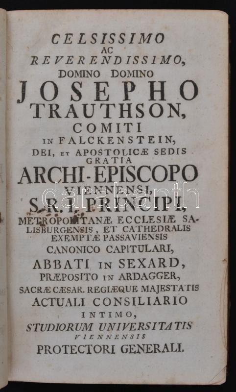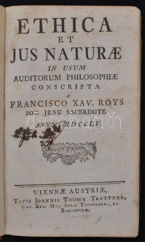 Roys, Franz Xaver: Ethica et jus naturae in usum auditorum philosophorum. Bécs, 1760, Trattner. Nyáry Antal László (?-?) tulajdonosi bejegyzésével. Kicsit sérült bőrkötésben, egyébként jó állapotban.