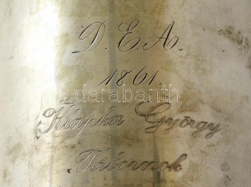 Leírás: Ezüst (Ag.) kupa "D. E. A. / 1861 / Klapka György / Tábornok" felirattal, jelzett, a felső illesztésnél javításra szorul, m: 27 cm, nettó 390 g