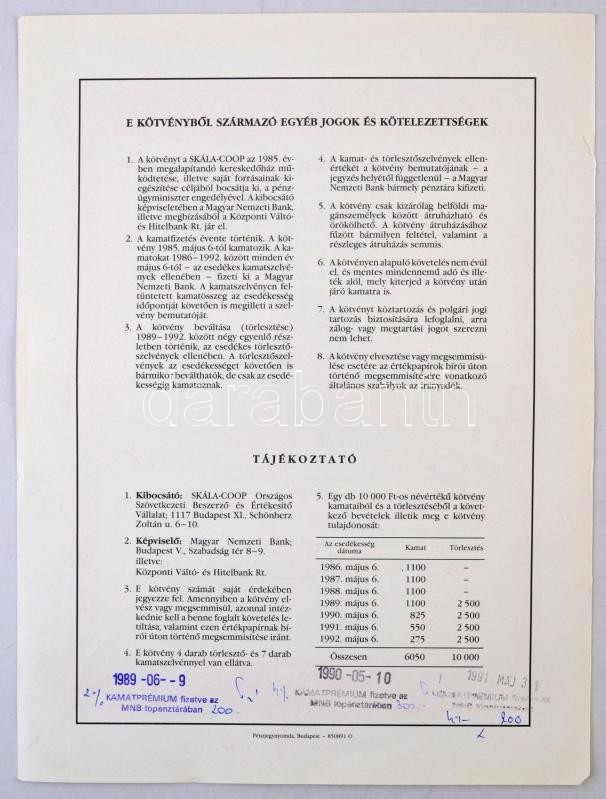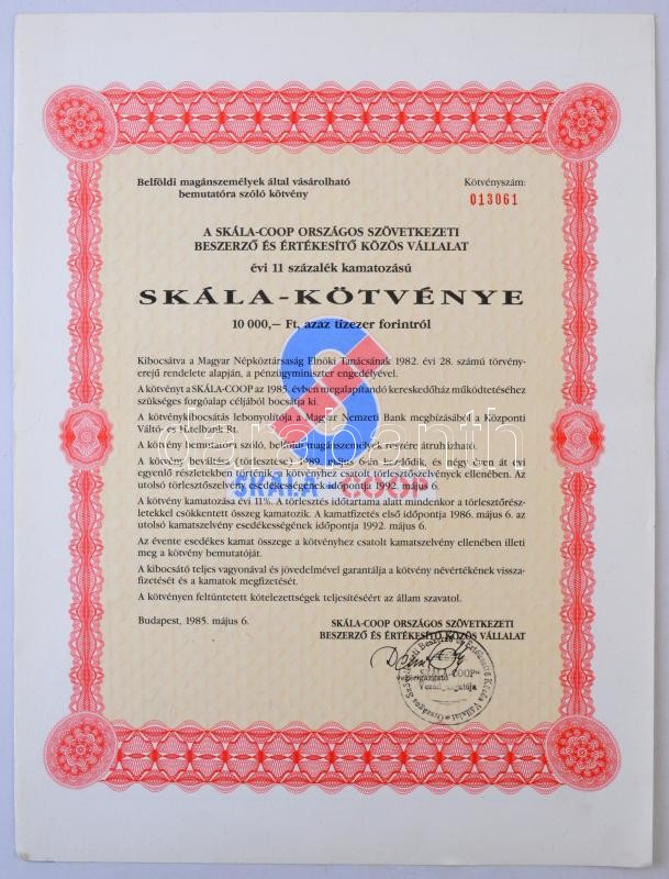 Leírás: Budapest 1985. "Skála-Coop Országos Szövetkezeti Beszerző és Értékesítő Közös Vállalat" kötvénye 10.000Ft-ról szelvények nélkül, bélyegzésekkel T:II