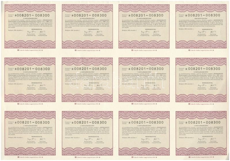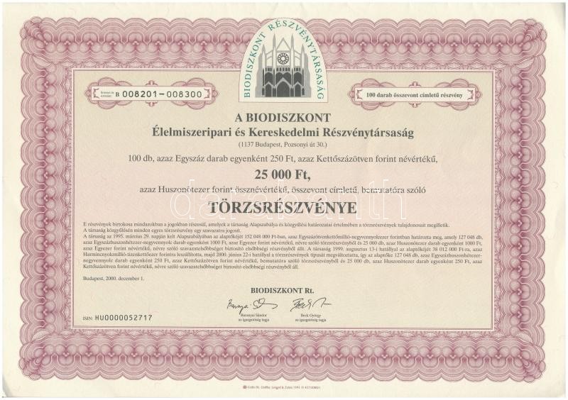 Leírás: Budapest 2000. "A Biodiszkont Élelmiszeripari és Kereskedelmi Részvénytársaság" száz darab törzsrészvénye összesen 25.000Ft-ról, szelvényekkel T:I-