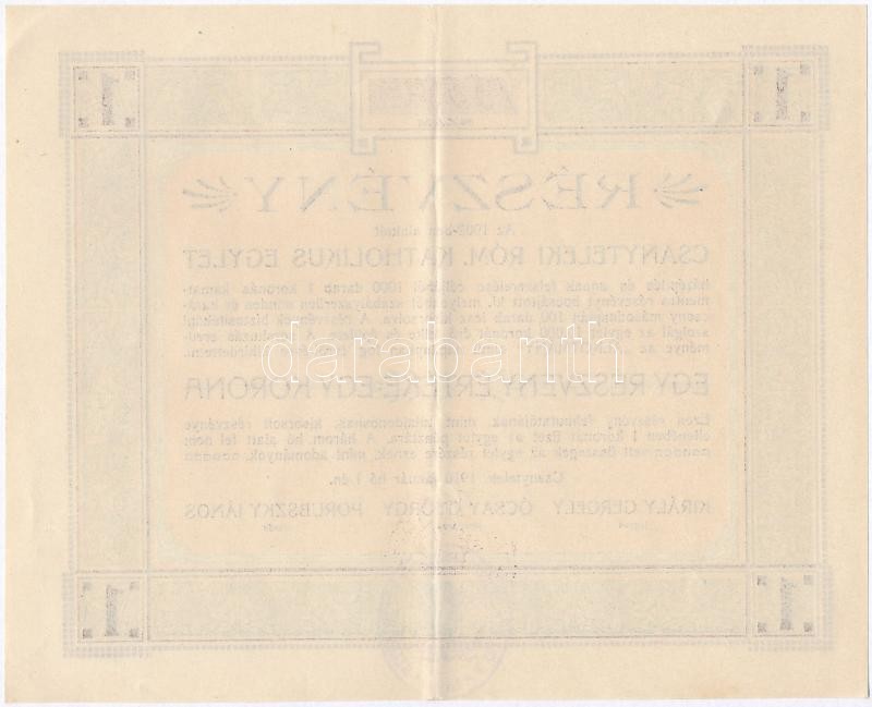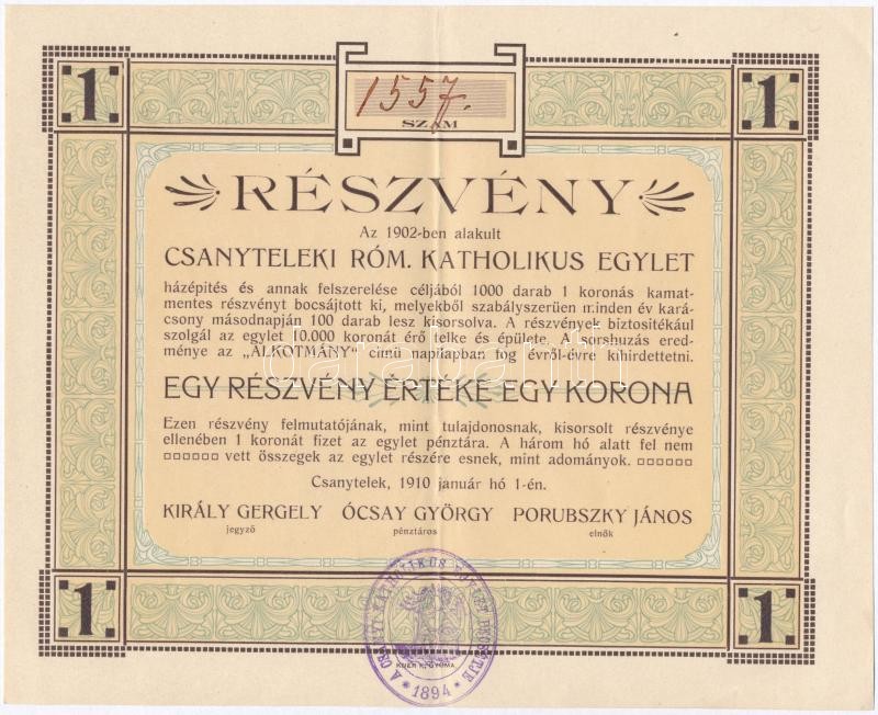 Leírás: Csanytelek 1910. "Csanyteleki Római Katholikus Egylet" sorsjegy-részvénye 1K-ról, bélyegzéssel T:II