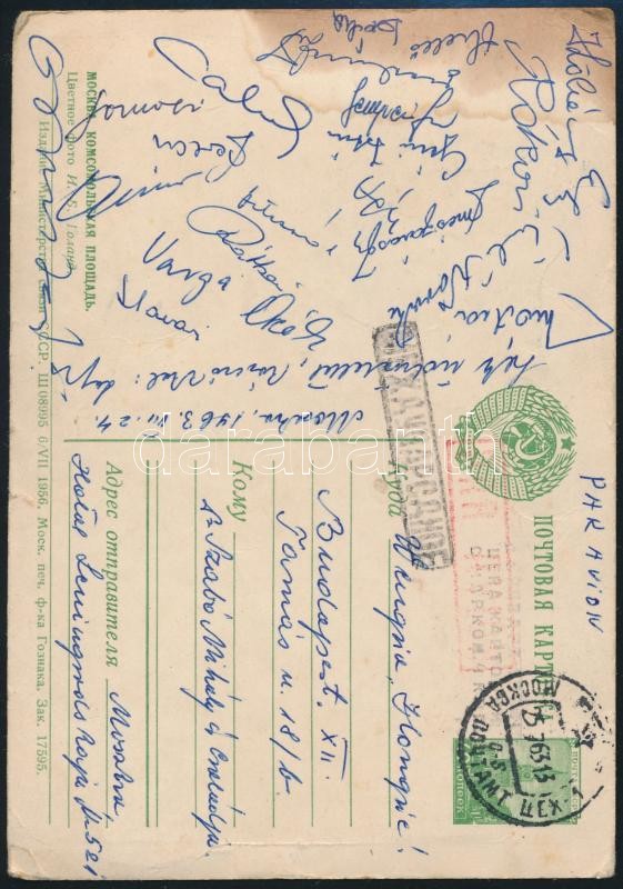 1963 A Ferencváros labdarúgó csapatának moszkvai útjáról hazaküldött lapja a játékosok aláírásával (Géczi, Novák, Juhász, Szűcs, Varga,, Rákosi, Mátrai, Deák Ferenc és mások)
