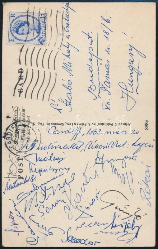 1963 A magyar labdarúgó válogatott tagjai által aláírt és hazaküldött képeslap Cardiffból a Wales elleni mérkőzésről. (többek között Mátrai, Rákosi, Sebes, Sipos, Szentmiklósi, Sándor, Mészöly és Szepesi György aláírásával )