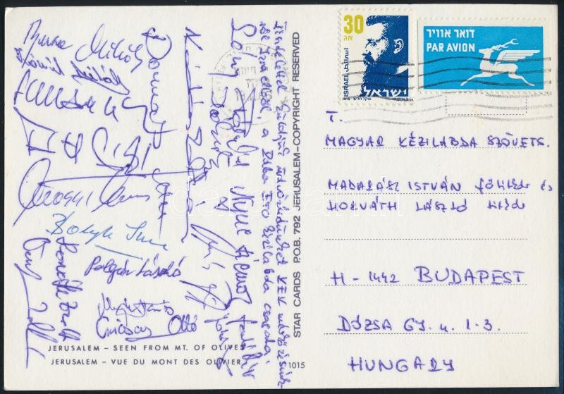 Leírás: A Rába ETO kézilabda csapat tagjainak (Bolyk, Polgár, Csicsay, stb.) aláírásai levelezőlapon