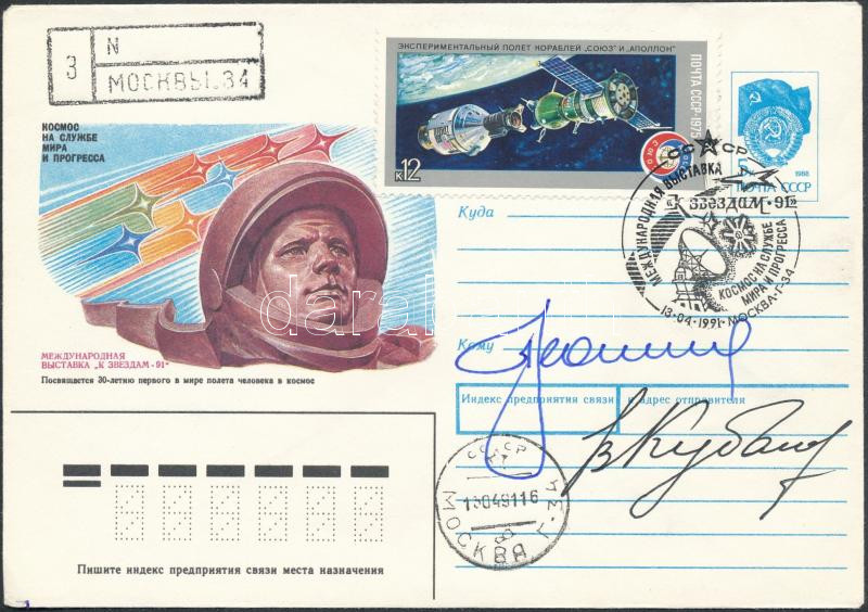 Leírás: Alekszej Leonov (1934- ) és Valerij Kubaszov (1935-2014) szovjet űrhajósok aláírásai emlékborítékon /