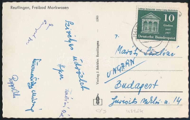 Tumpek György (1929- ), Európa bajnok, Littomeritzky Mária (1927- ) Európa és olimpiai bajnok és más magyar úszók aláírásai Németországból küldött levelezőlapon