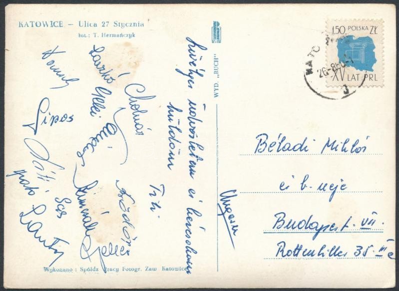 Leírás: cca 1960 Az MTK labdarúgó csapat tagjai által aláírt képeslap a Katowice elleni mérkőzésről rajta Lantos, Gelei, Arató, Sipos és sokan mások.