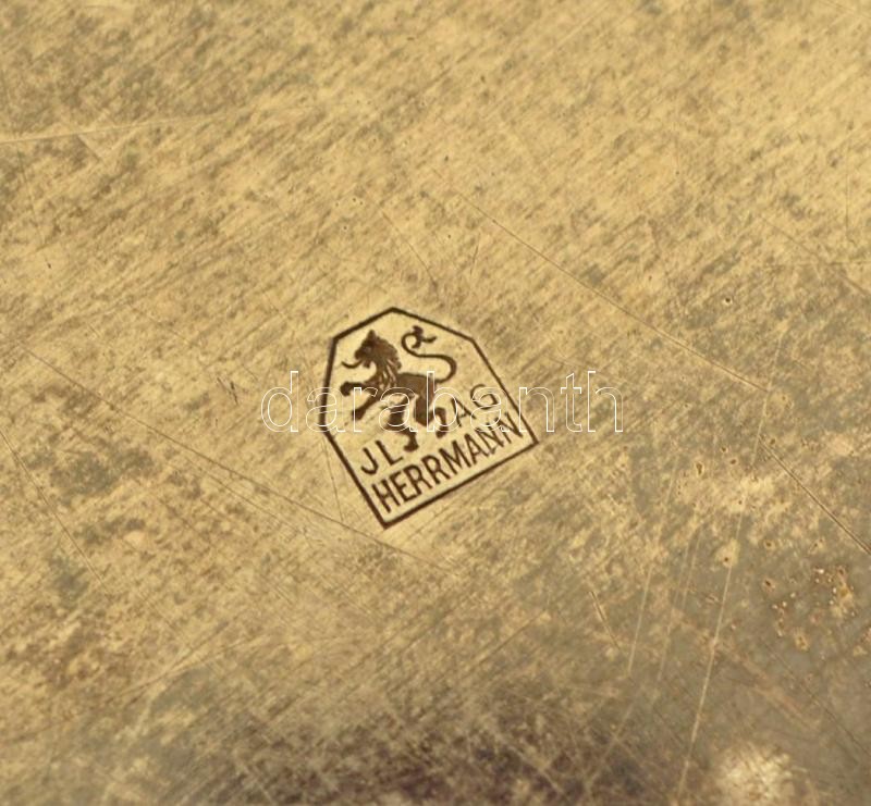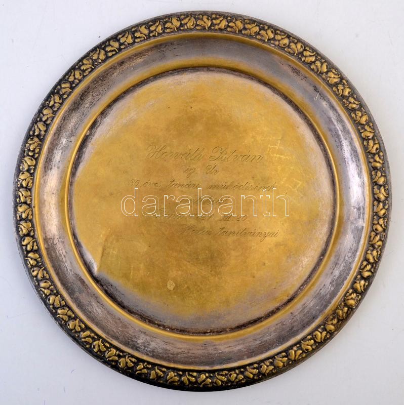 Leírás: 1927 Alpakka dísztál, pápai tanárnak ajándékozott, gravírozott szövegel, jelzett (JL Hermann), d: 24,5 cm