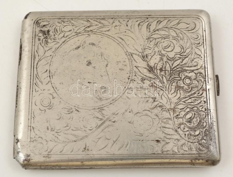 Leírás: Kopott gravírozású lófejes fém cigarettatárca 10x8 cm