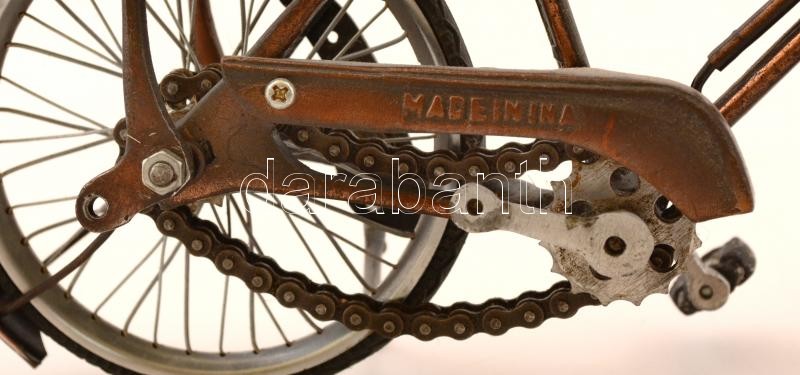 Teljesen funkcionális élethű biciklimakett fémből, forgatható alkatrészekkel, pedállal, lánccal, egyik kormányszarv letört, de egy pötty forrasztással visszahelyezhető / Completely functional bike modell, with a rapairable fault. 30x19 cm