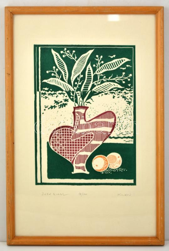 Leírás: Kádár György (1912-2002): Zöld levelek. Színes linó, papír, jelzett, üvegezett keretben, 37×26 cm