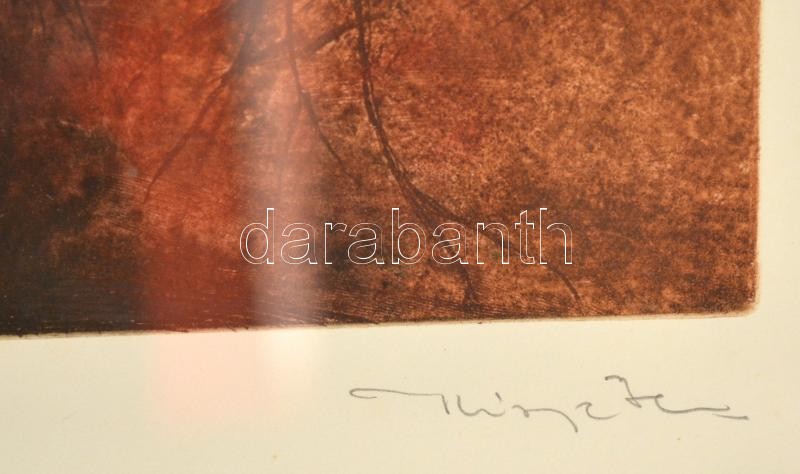 Leírás: Kiss Péter (1957-): Siketfajd. Színes rézkarc, papír, jelzett, üvegezett keretben, 34×29 cm