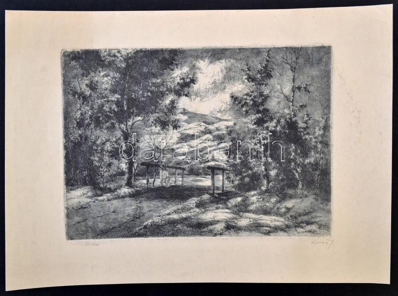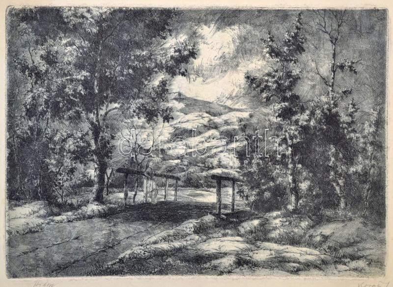 Leírás: Kováts jelzéssel: Hídon. Rézkarc, papír, jelzett, 20x28 cm