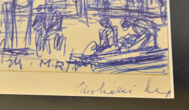 Leírás: Mohácsi Regős Ferenc (1917-2003): Utcarészlet, toll, papír, jelzett, paszpartuban, üvegezett fa keretben, 9×14 cm