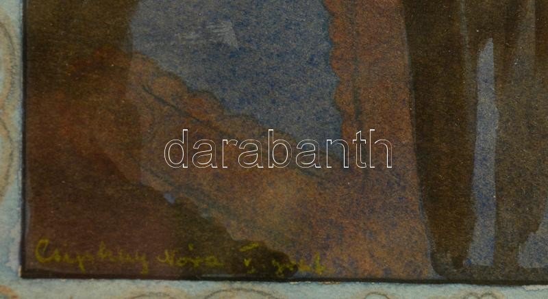 Leírás: Olvashatatlan jelzéssel: Mese illusztráció. Akvarell, papír, üvegezett keretben, 21×17 cm