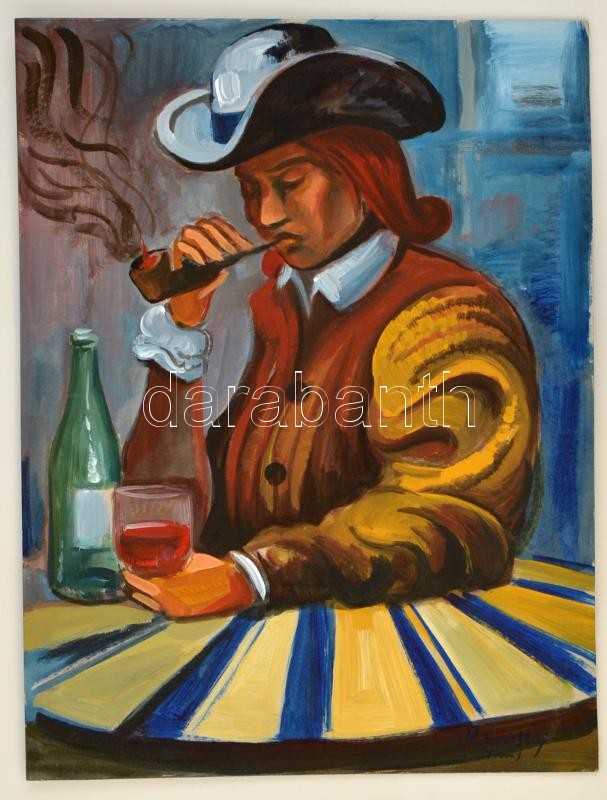 Leírás: Remsey jelzéssel: Pipázó az asztalnál. Olaj, karton, 55×43 cm