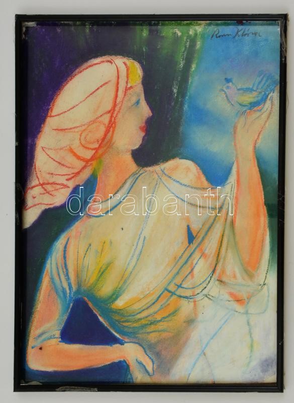 Leírás: Róna jelzéssel: Lány kis madárral. Pasztell, papír, üvegezett keretben, 39×29 cm