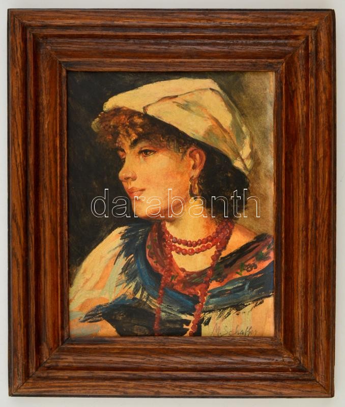 Leírás: Schaffer jelzéssel: Női portré, olaj, vászon, fa keretben, olaj, karton, 23,5×18 cm