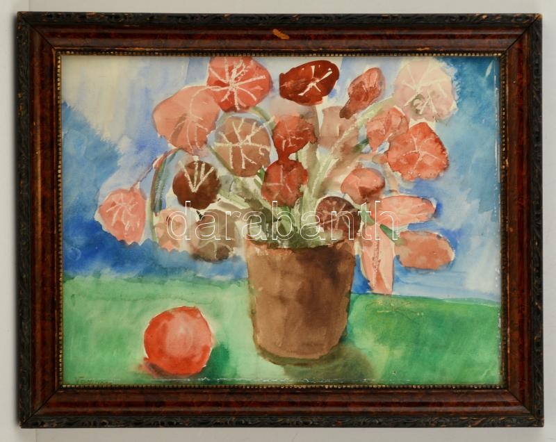 Leírás: Vaszary jelzéssel: Virágcsendélet. Akvarell, papír, üvegezett keretben, 29×39 cm