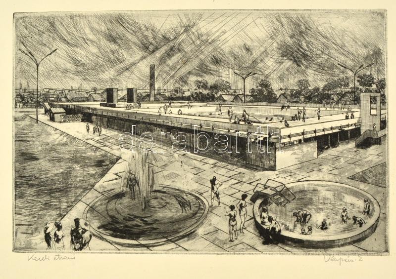 Leírás: Veszprémi Endre (1925- ): Keceli strand, rézkarc, papír, jelzett, 19,5×30 cm