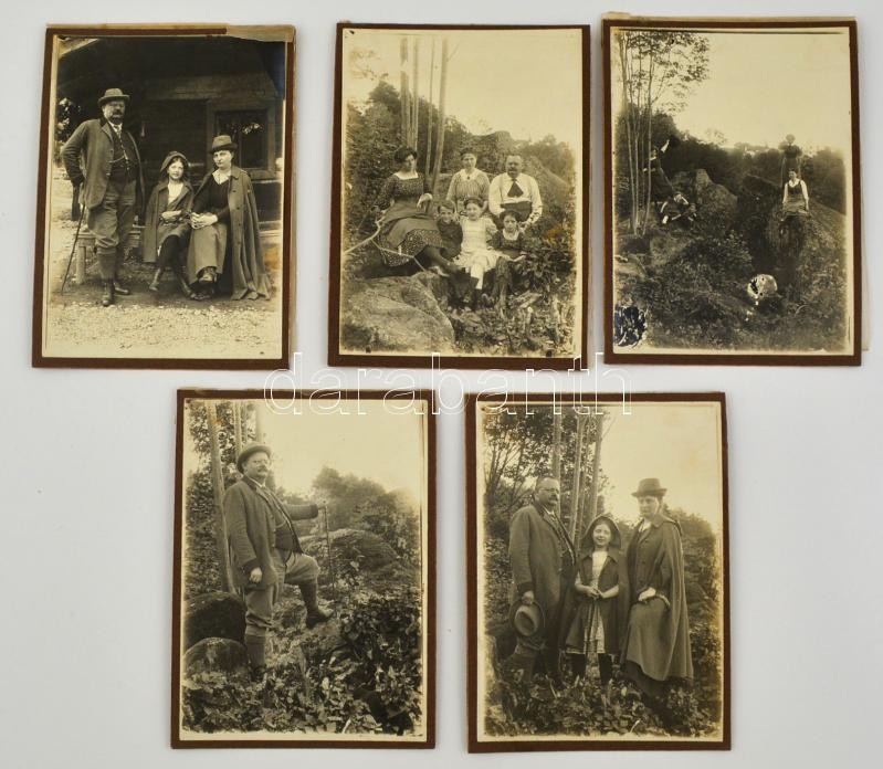 1914 Photos of a family hiking trip, 5 pieces, photos on cartboard, with writings on the back, 17x13 cm.
