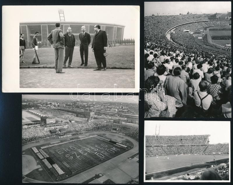 Leírás: cca 1963 Budapest, Országos Sportnapok a Népstadionban, futballmeccs, stb., 4 db fotó, közte feliratozott sajtófotó, 6x9 és 9x14 cm közötti méretekben