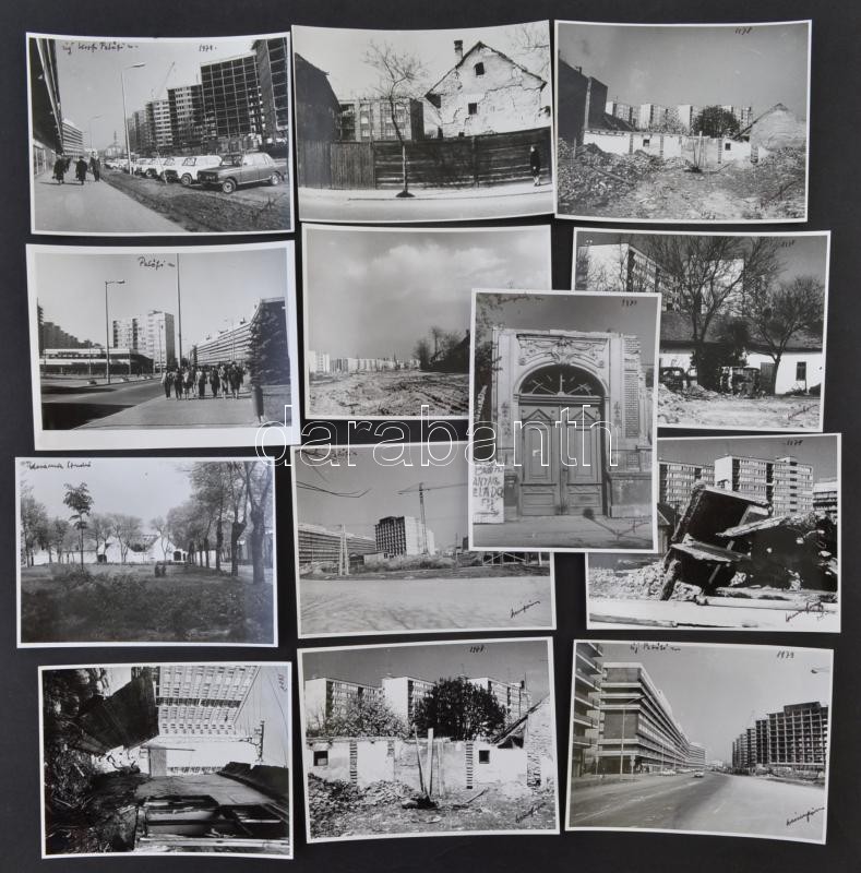 Leírás: cca 1978 Kecskeméti városképek, 13 db vintage fotó Vincze János (1922-1998) hagyatékából, részben feliratozott, 9x12 cm