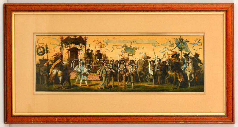 Leírás: Díszes fa képkeret üveggel, benne érdekes nyomattal, belső méret: 29×63 cm, külső méret: 35,5×69,5 cm