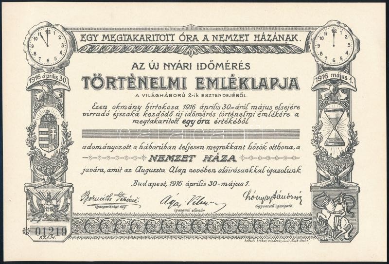 Leírás: 1916. "Az új nyári időmérés történelmi emléklapja" adomány a "Nemzet Háza" javára 2K értékben, sorszámozott, kiváló állapotban