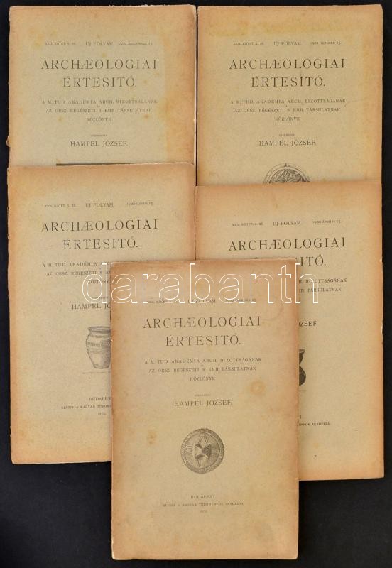 1902 Archaeologiai Értesítő. XXII. kötet 1-5. szám. Szerk.: Hampel József. Bp., 1902, MTA. Kiadói papírkötésben, változó állapotban, kissé szakadozott gerinccel, egy szám szakadozott borítóval, sérült kötéssel ( 5. számok), de a többi jó állapotban, XXXII+448 p. Teljes! Felvágatlan számokkal!