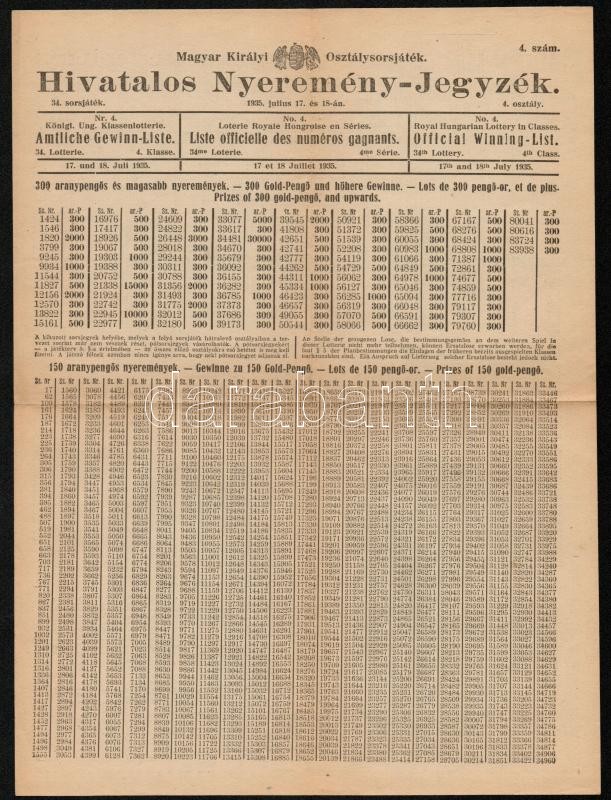 1935 Magyar Királyi Osztálysorsjáték Hivatalos Nyeremény-jegyzék, 34. ... https://www.darabanth.com/hu/299-Gyorsarveres/299.0/Festmeny-mutargy-papirregiseg-egyeb/Nyomtatvanyok~29/1935-Magyar-Kiralyi-Osztalysorsjatek-Hivatalos-Nyeremeny-jegyzek-34-sorsjatek-3-szam-3~II1567520