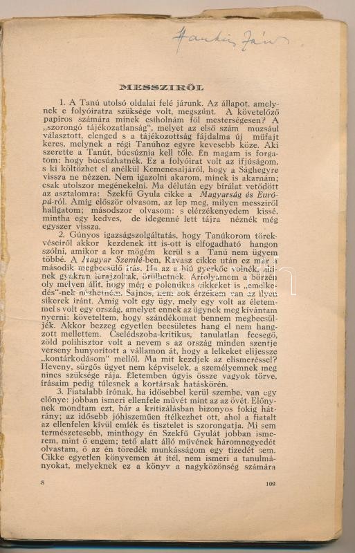 Leírás: 1936 Tanu III-IV.száma. Németh László kritikai folyóirata. Kecskemét, 1936, Első Kecskeméti Hirlapkiadó- és Nyomda Rt. Kiadói, szakadt, viseltes papírkötésben. Hankiss János (1893-1959) irodalomtörténész aláírásával.
