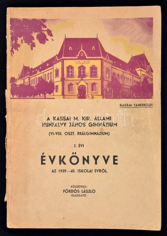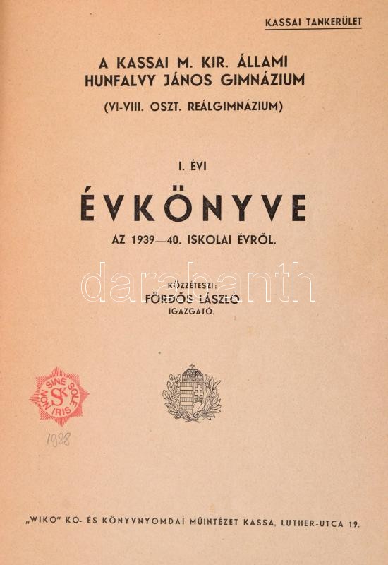 1940 Kassai M. Kir. Állami Hunfalvy János Gimnázium I. évi évkönyve az 1939-1940. iskolai évről. Közzéteszi: Fördős László igazgató. Kassa, Wiko. Papírkötés, kissé viseltes gerinccel.