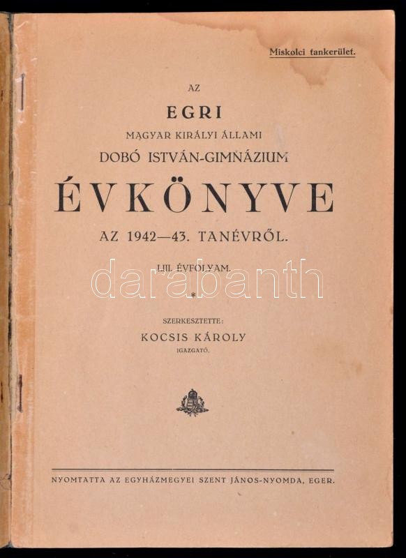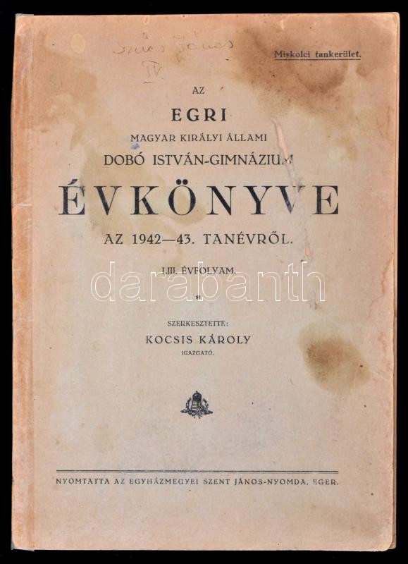 1942-1943 Az Egri Magyar Királyi Állami Dobó István Gimnázum évkönyve az 1942/1943 tanévről. LIII. évf. Szerk.: Kocsis Károly. Eger, Egyházmegyei Szent János Nyomda. Papírkötés, sérült, kissé foltos borítóval, ragasztott gerinccel. Vitéz Nagybányai Horthy István haláláról megemlékező oldallal.