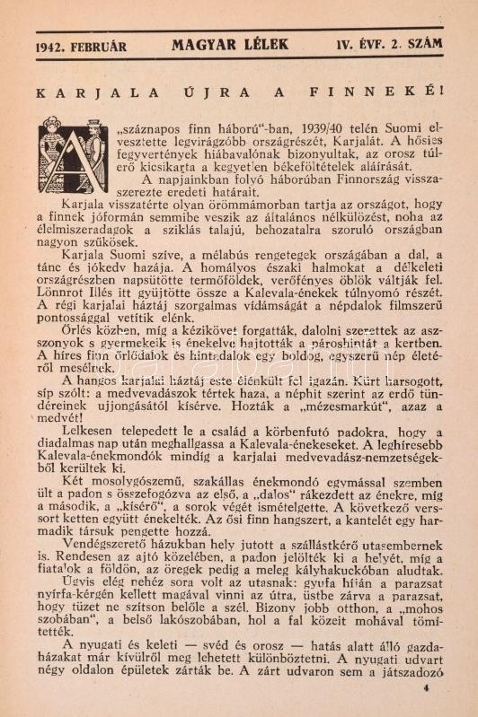 Leírás: 1942 Magyar lélek. A magyar népművelők országos folyóirata. Szerk.: Hankiss János. 1942. február. IV. évf., 2. szám. Papírkötés.
