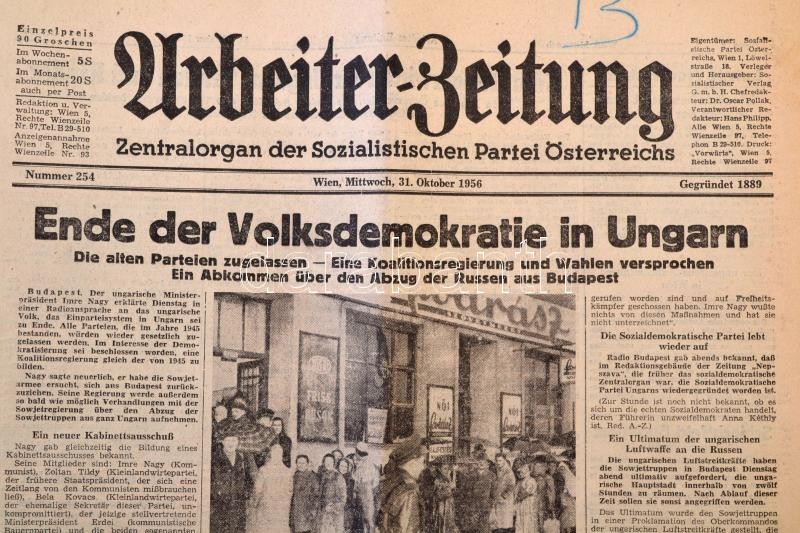 Leírás: 1956 Az osztrák Arbeiter Zeitung magyar forradalomról tudósító száma